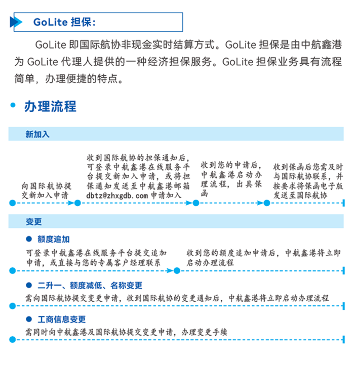 GOLITE担保业务办理程序 一、业务申请 代理人办理GOLITE业务(新加入、二升一等)时,需先向国际航空运输协会(加拿大)北京办事处(以下简称“国际航协”)提交申请。我公司收到国际航协担保通知后会及时联系代理人,邮寄《材料清单》、担保协议等相关文件。 二、提交资料 我公司根据代理人申请办理的业务类型出具《材料清单》,代理人按《材料清单》准备资料,快递至我公司。《材料清单》中所列资料为基本材料,我公司会根据基本材料审核结果判断是否需代理人补充提交其他资料,如需补充会另行通知代理人。 三、业务审批 我公司对代理人提交的资料进行业务审批,审批过程中如存在问题,将电话通知代理人补充相关资料。