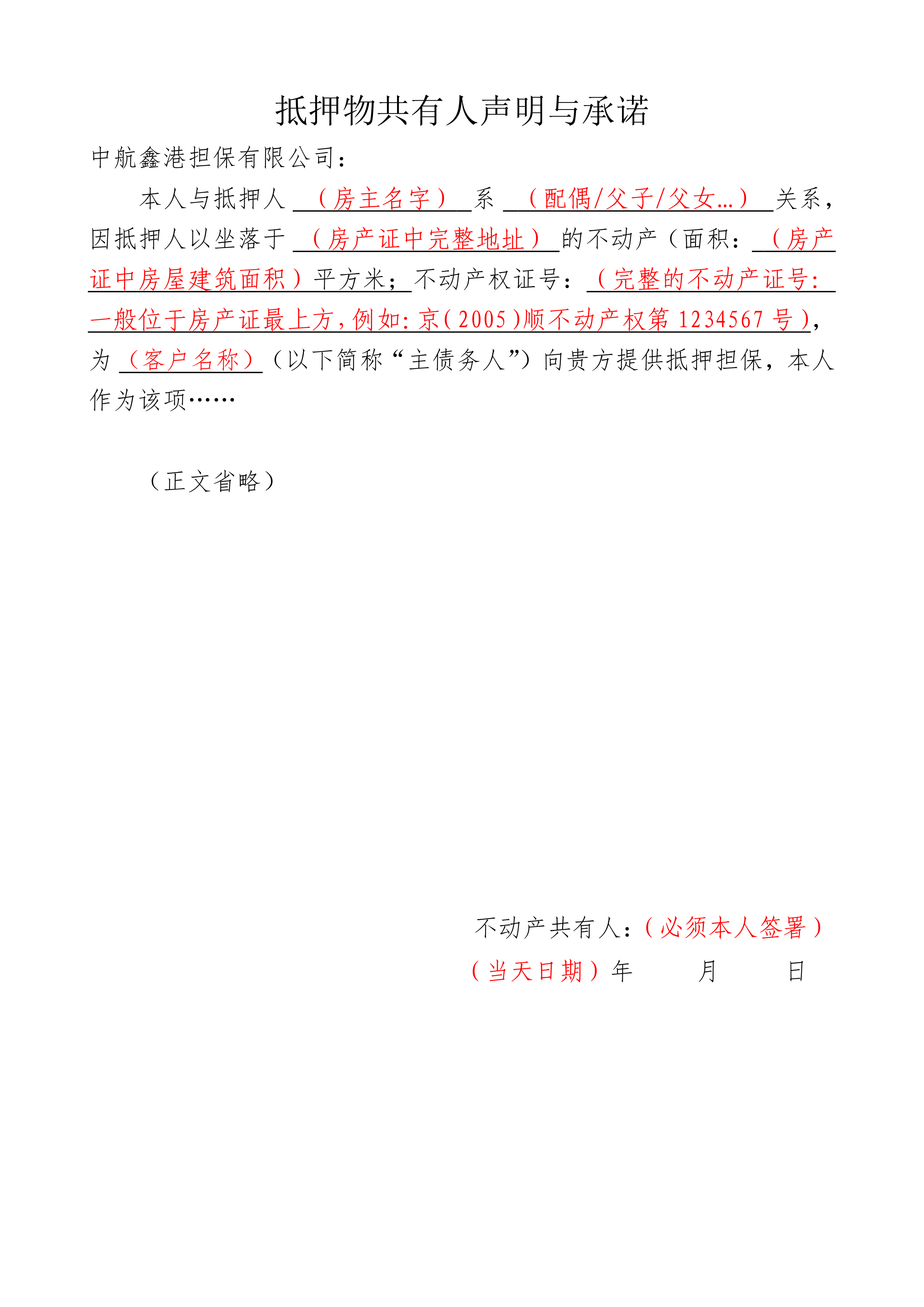 抵押物共有人声明与承诺
