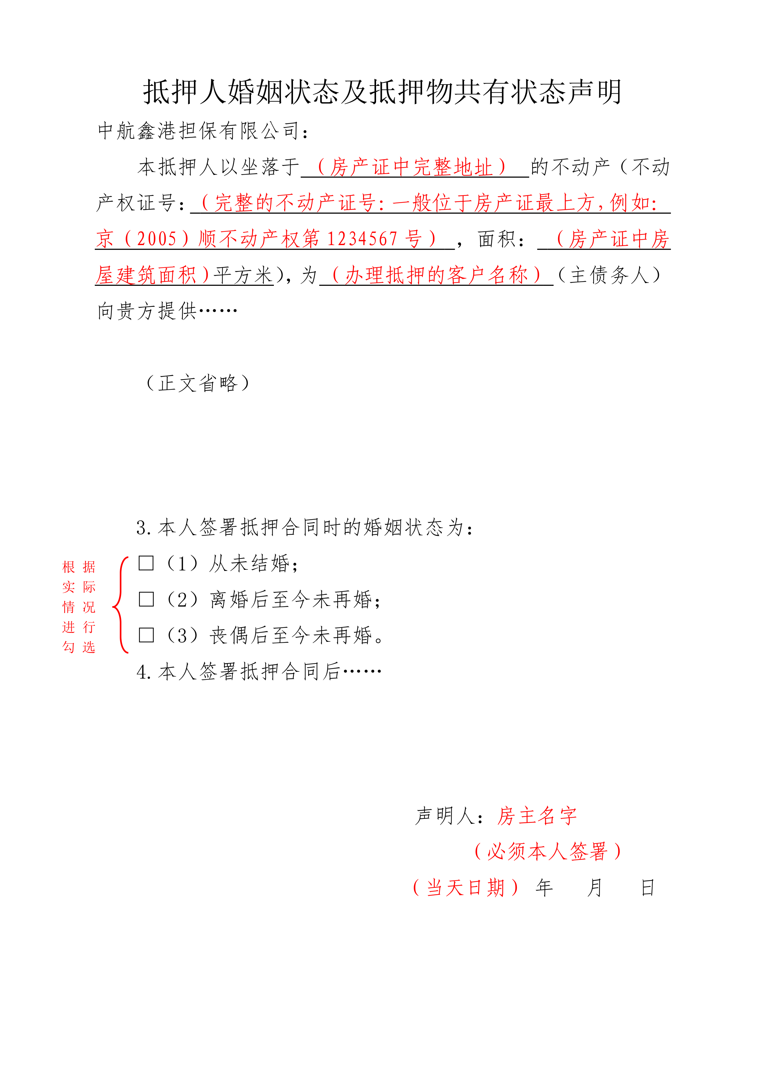 抵押人婚姻状态与抵押物共有状态声明